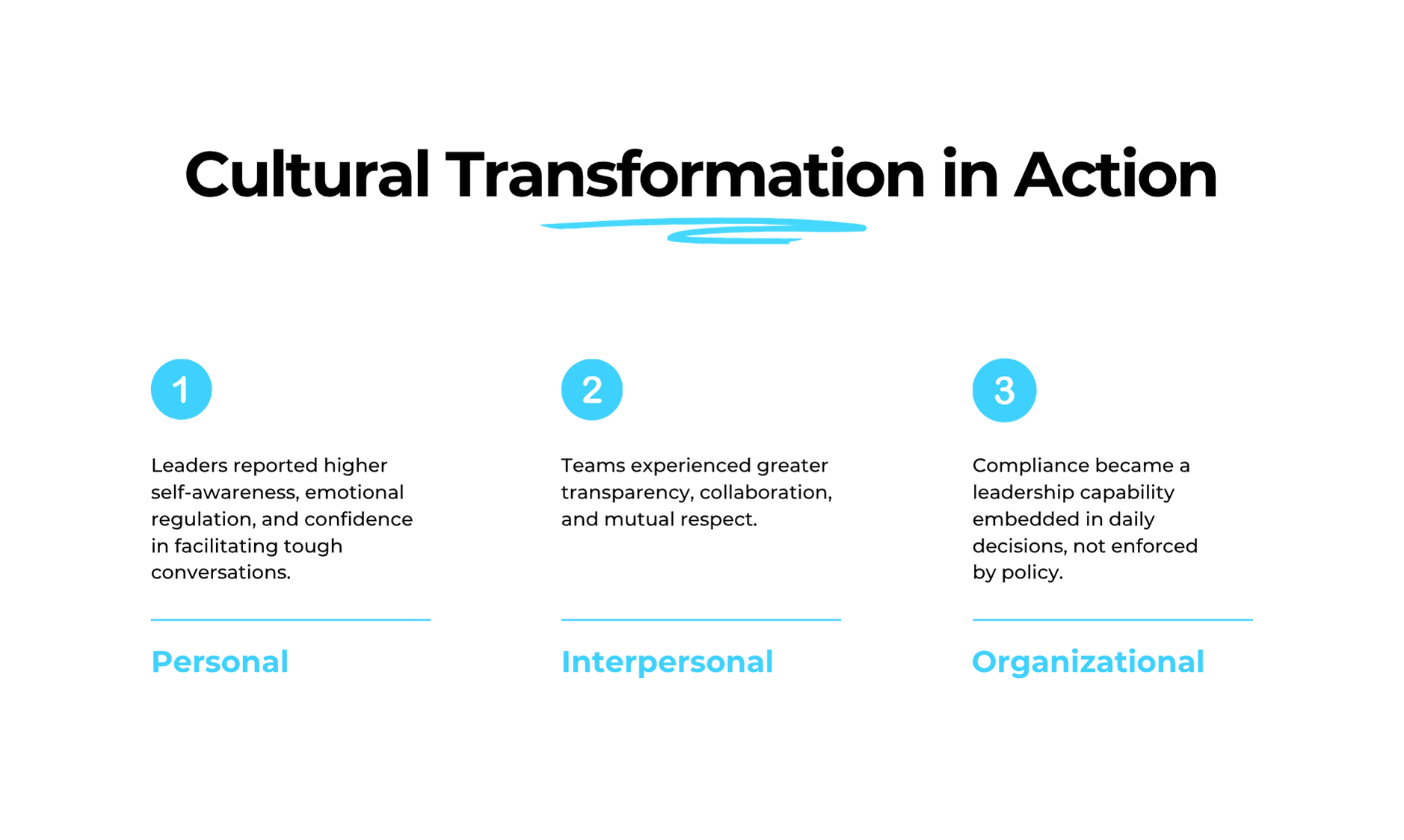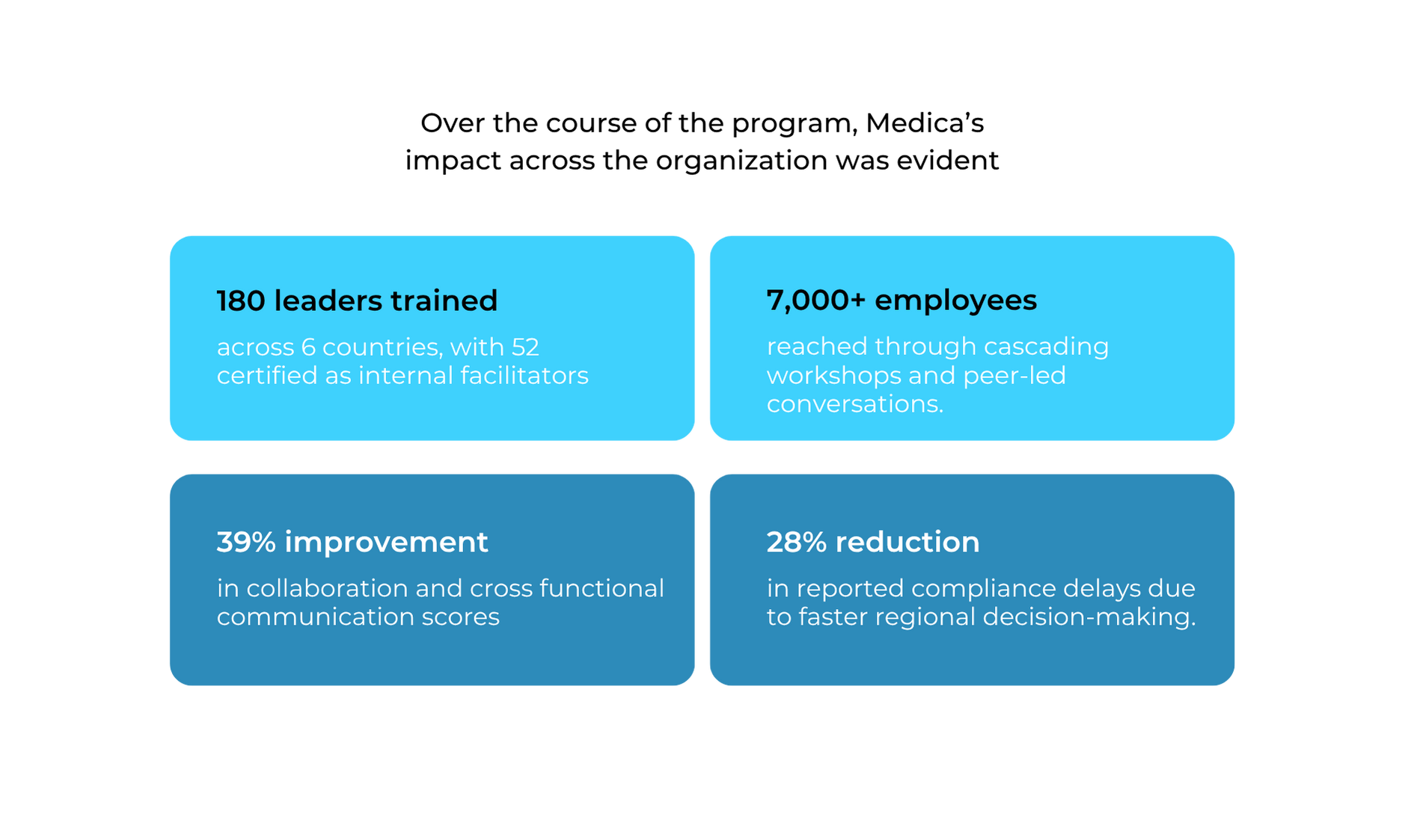 This shift required key leaders to evolve from “compliance officers” to “leading complex change”. Senior leaders were challenged by the board to empower their regional teams to take ownership, strengthen accountability, and align behavior with Medica’s values of integrity, collaboration, and accountability.