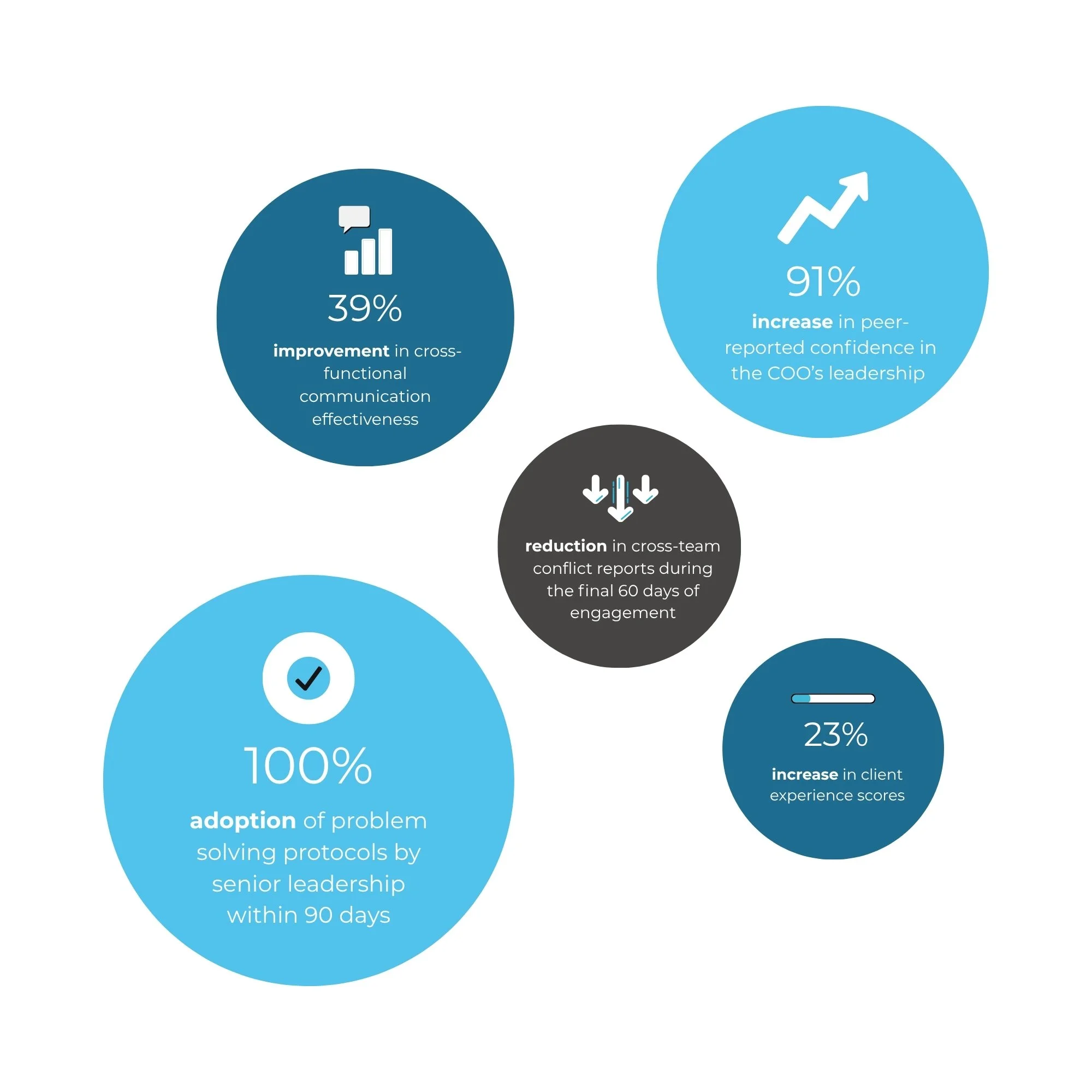 The COO’s evolution—from task-driven work horse to intentional, people-centered leader—set the tone for sustainable transformation. The leadership team began to shift from a crisis-management mindset to a more intentional, collaborative model rooted in alignment, mutual ownership, and effective accountability measures. Conversations moved from defensive to strategic and cross-functional collaboration shifted from siloed to systems thinking.